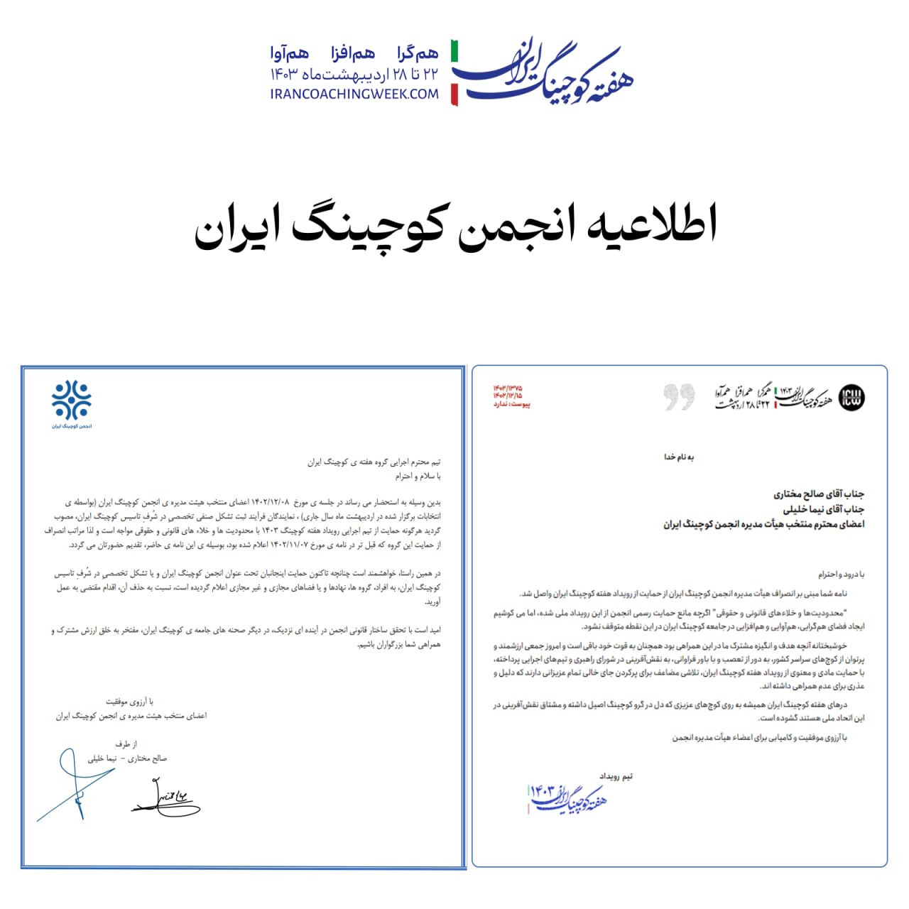نامه ی ارسالی انجمن کوچینگ ایران در خصوص حمایت معنوی از هفته کوچینگ ایران 1403