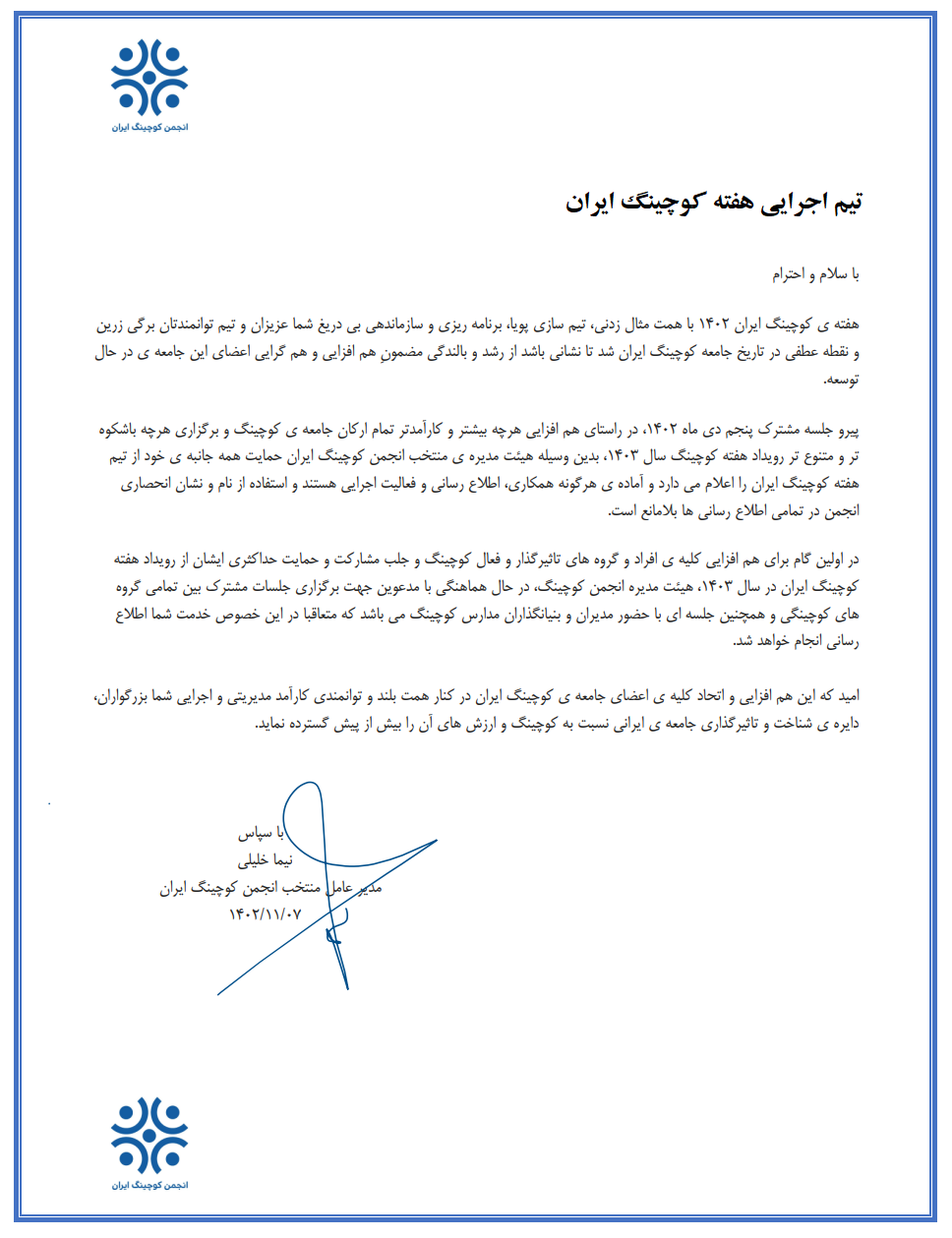 فعالیت تیم هفته کوچینگ ایران ١۴٠٣ رسما آغاز شد🎉 برای یک حرکت هماهنگ و با شعار همگرا،...